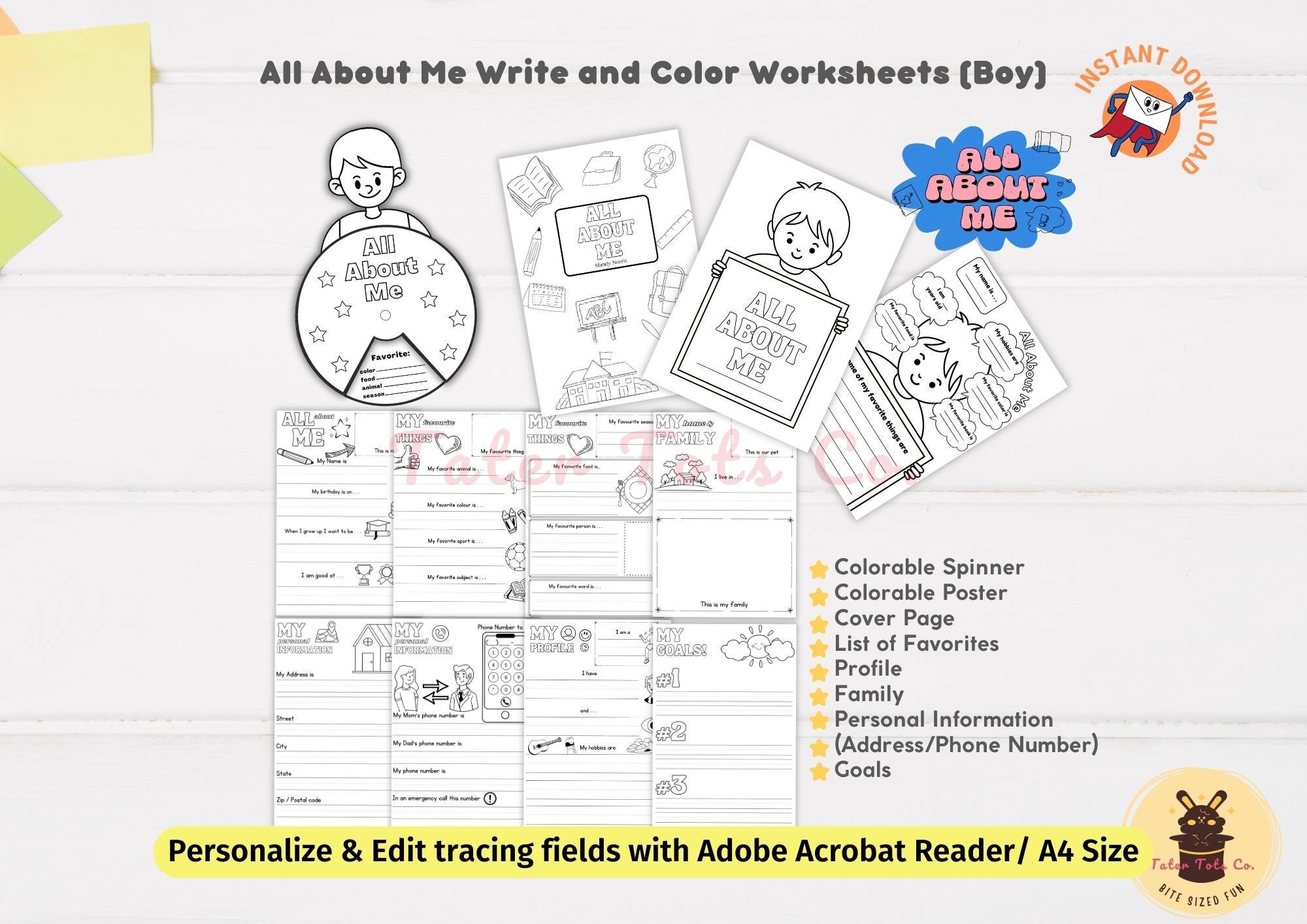 Personalized All About Me Letter and Number Tracing Preschool Worksheet (Boy) - Free Spinner Colorable Questionnaire Instant Download