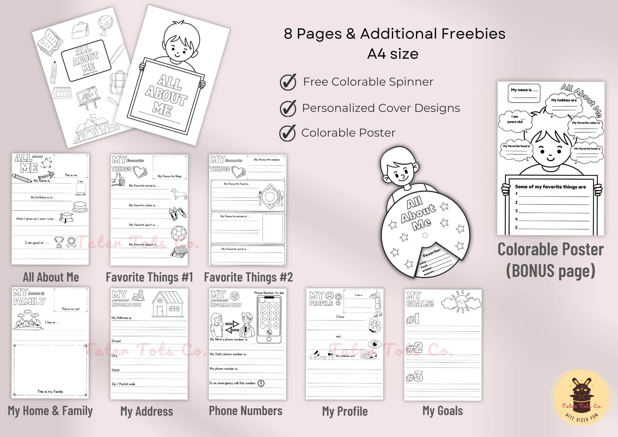 For young kids, it can be used as a personalized teaching tool to help the child write down their profile, favorite things, and personal information (address/important contacts). Kids can color the pictures, and draw or paste photos while tracing alphabets and numbers.