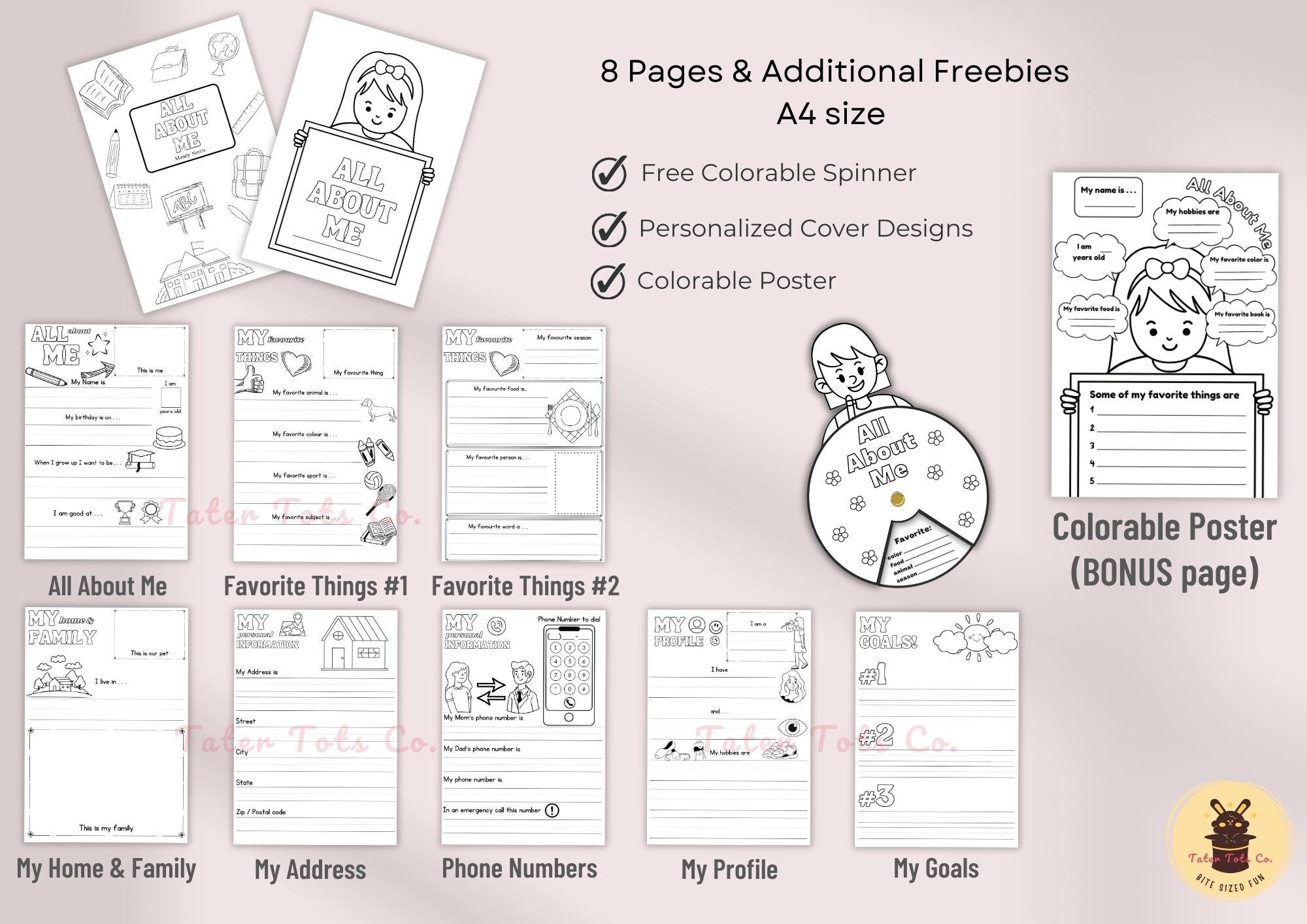 For young kids, it can be used as a personalized teaching tool to help the child write down their profile, favorite things, and personal information (address/important contacts). Kids can color the pictures, and draw or paste photos while tracing the alphabet and numbers.
