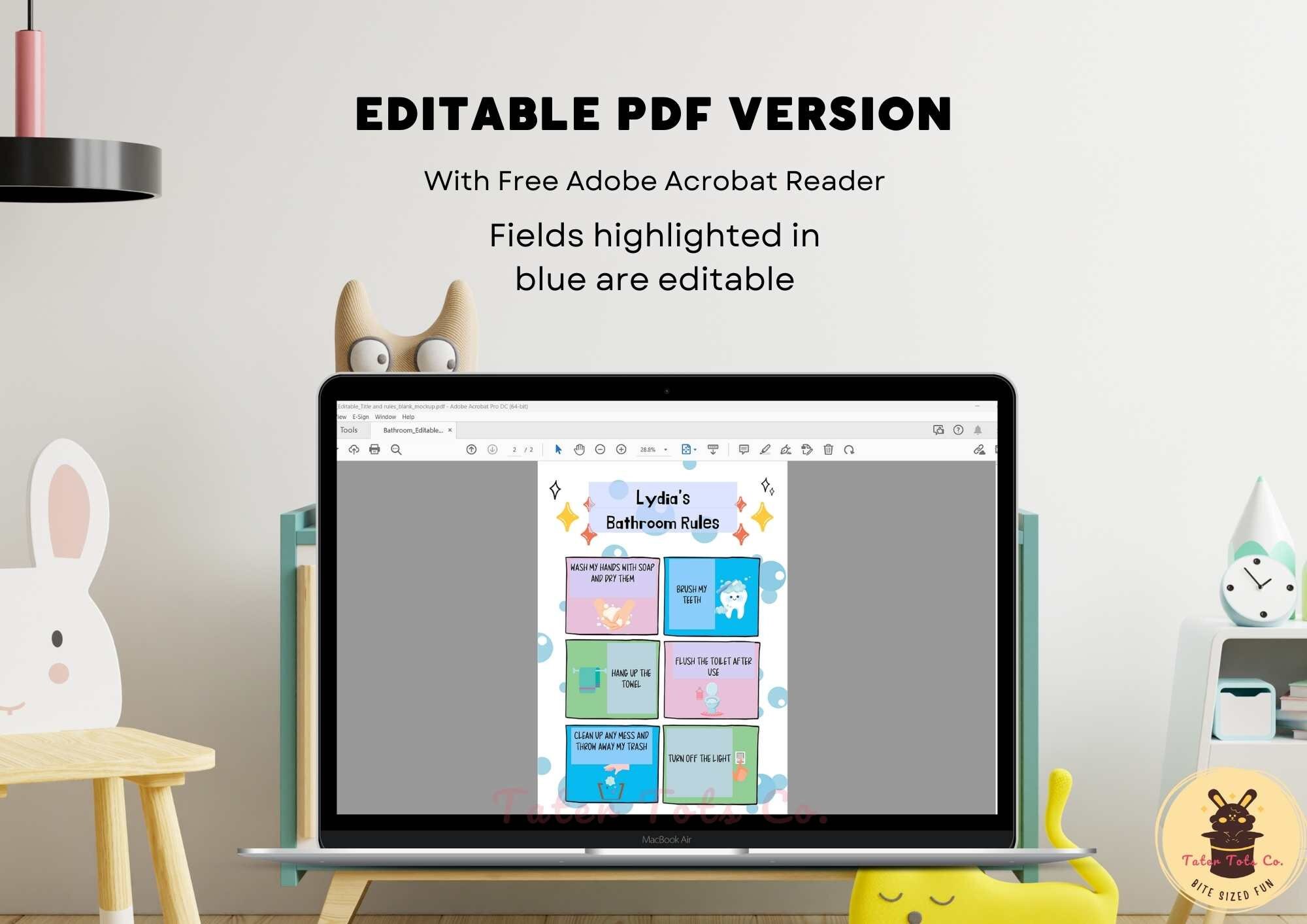 You can edit both Title and Rules in this Editable PDF for a more personalized house rules template (i.e, add in family name or child's name). You can edit 2 title rows. If you do not wish to edit the title and leave it as "We love the golden rules..Bathroom Rules I will," then you can use the Editable PDF for rules only.