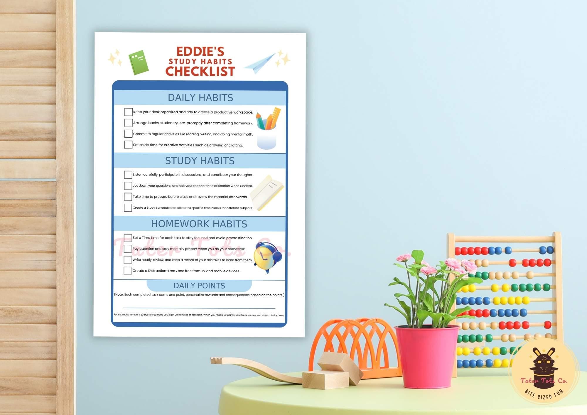 Personalized Editable Study Habits Checklist for Elementary Students - Promote Self-Discipline and Independence - Instant Download PDF