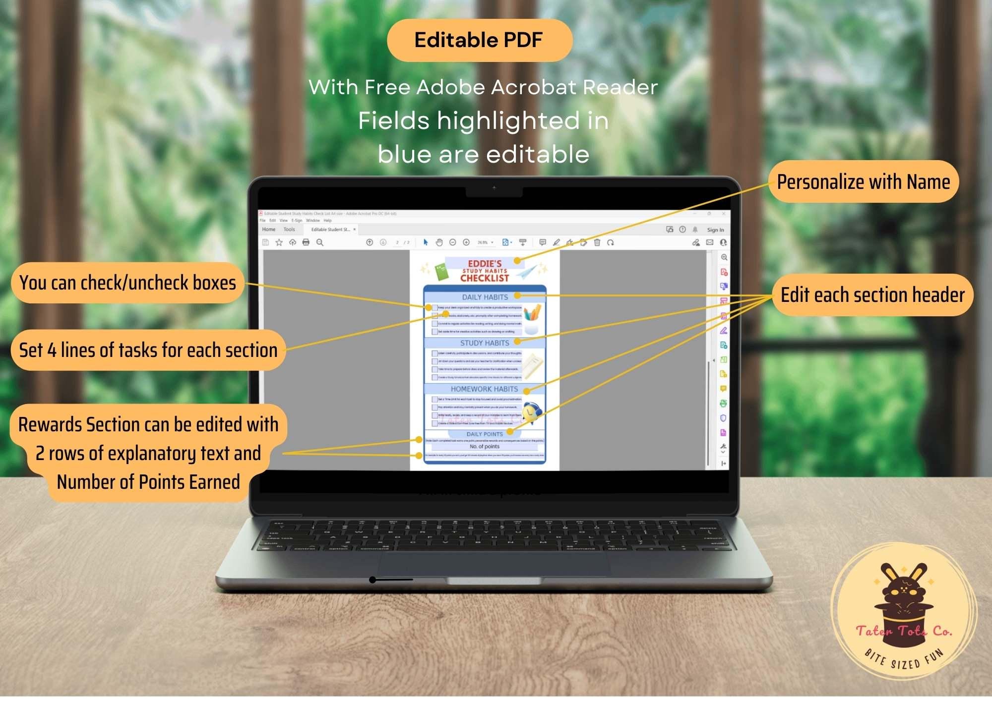• Personalized Editable Study Habits Check List up to A2 size