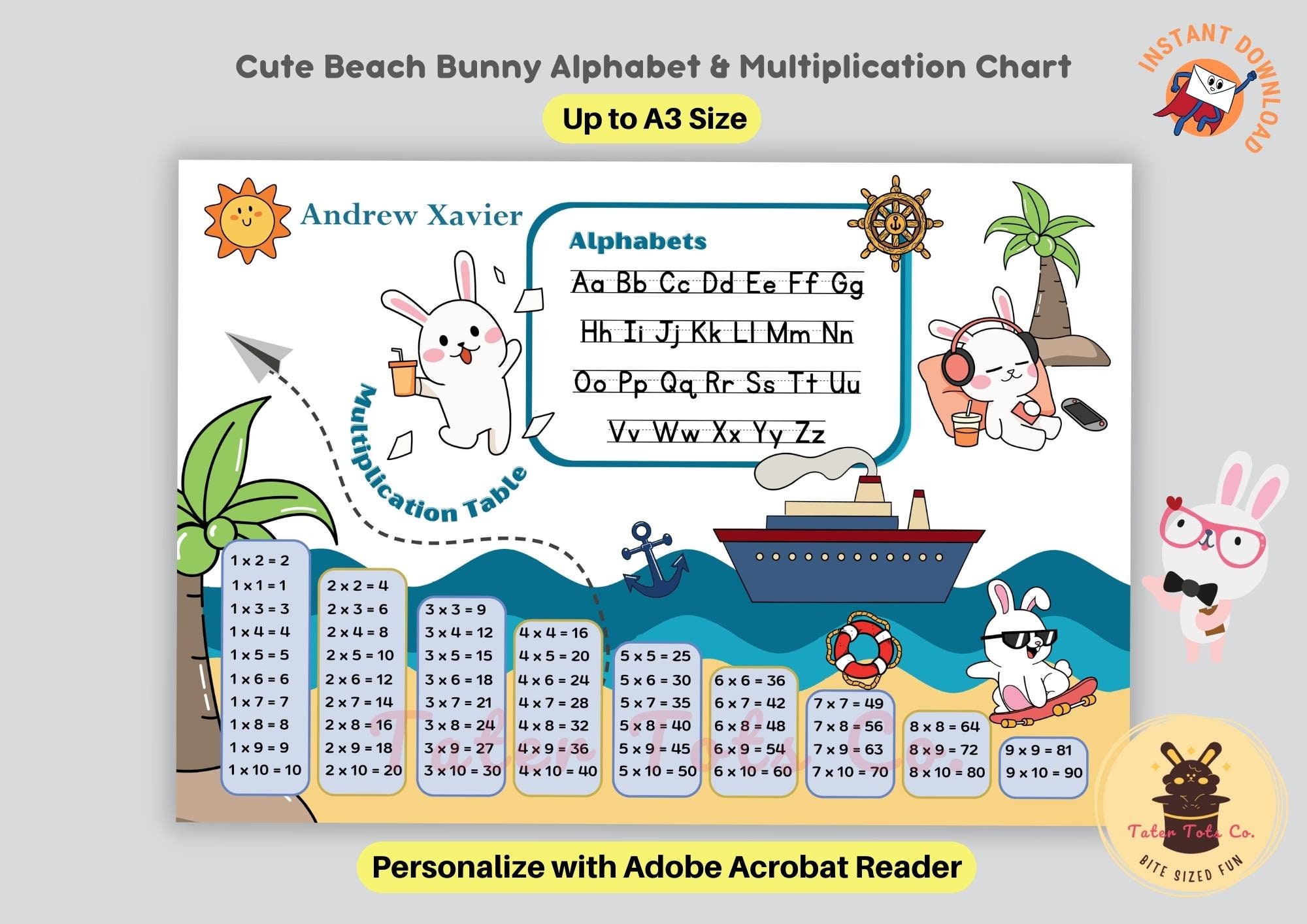 Personalized Summer Time Beach Bunny Math Chart - Alphabet Tracing & Multiplication Table for 1st to 3rd Grade - Instant Download PDF