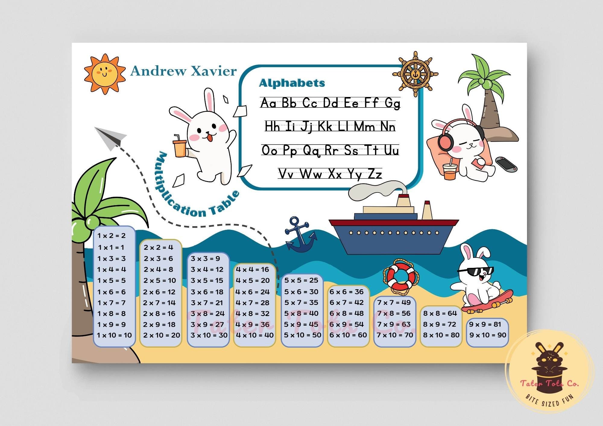 Our Personalized Cute Summer Time Beach Bunny Math Chart is designed to make learning an enjoyable experience for 1st to 3rd graders. It features a cute cartoon bunny enjoying beach time, adding a playful touch to education. The chart combines alphabet tracing with a multiplication table, providing a comprehensive learning tool.