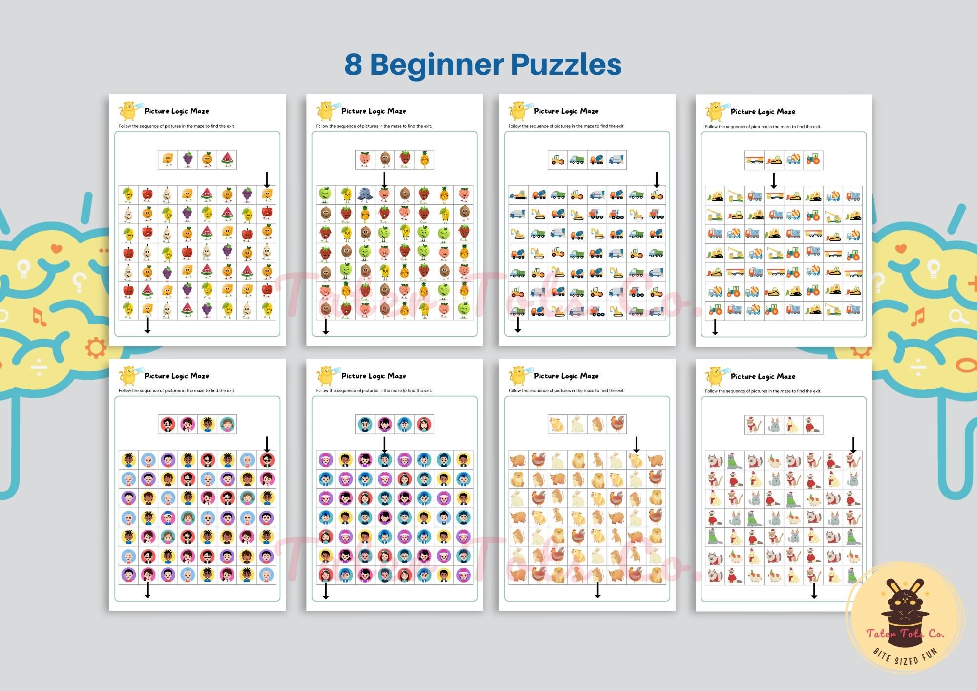 Picture Logic Maze Puzzle: Beginner Set of 8 (PDF Download)