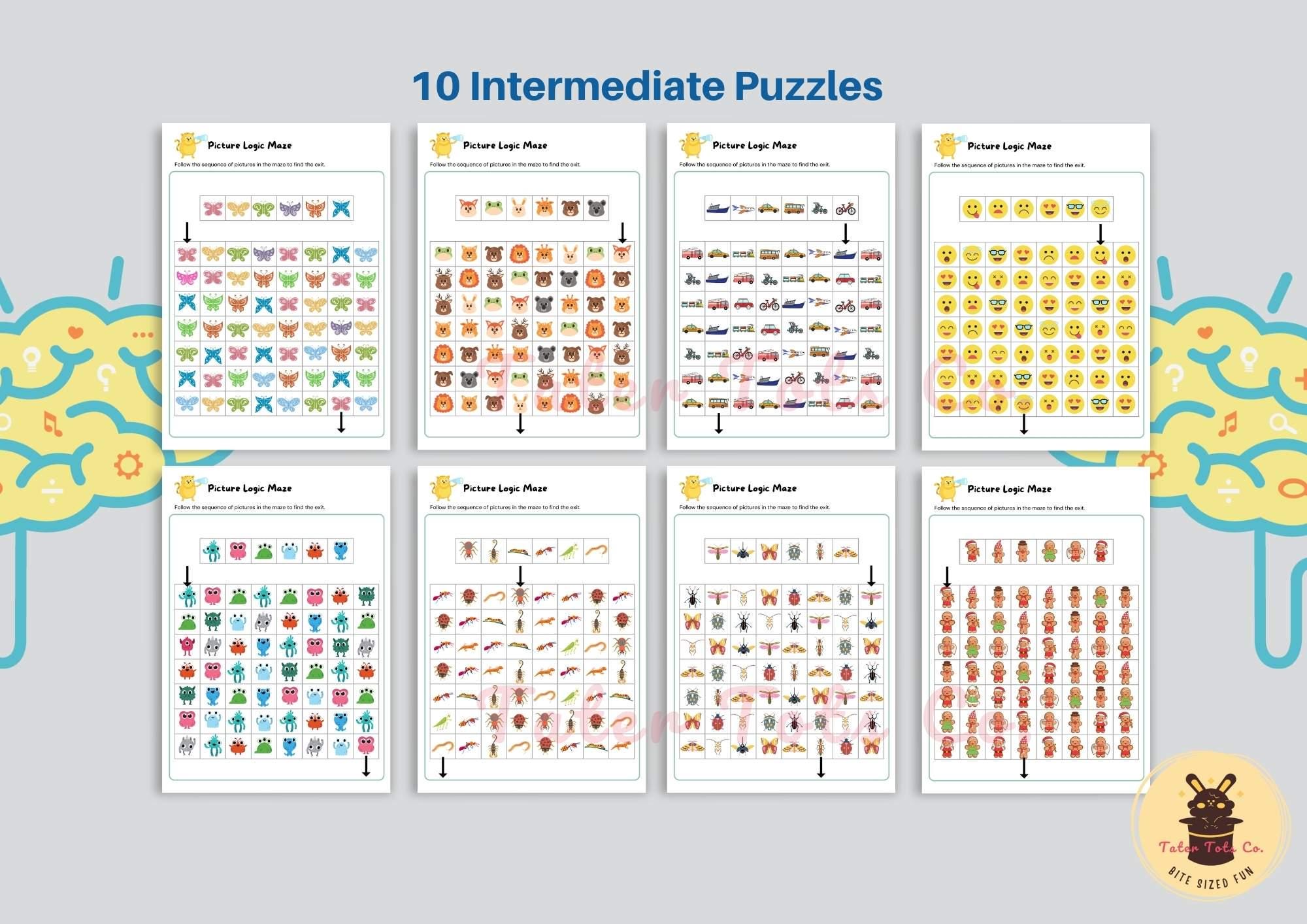 Picture Logic Maze Puzzle Intermediate Level Set of 10 Engaging Mazes for Young Kids with Answer Key Instant Download PDF