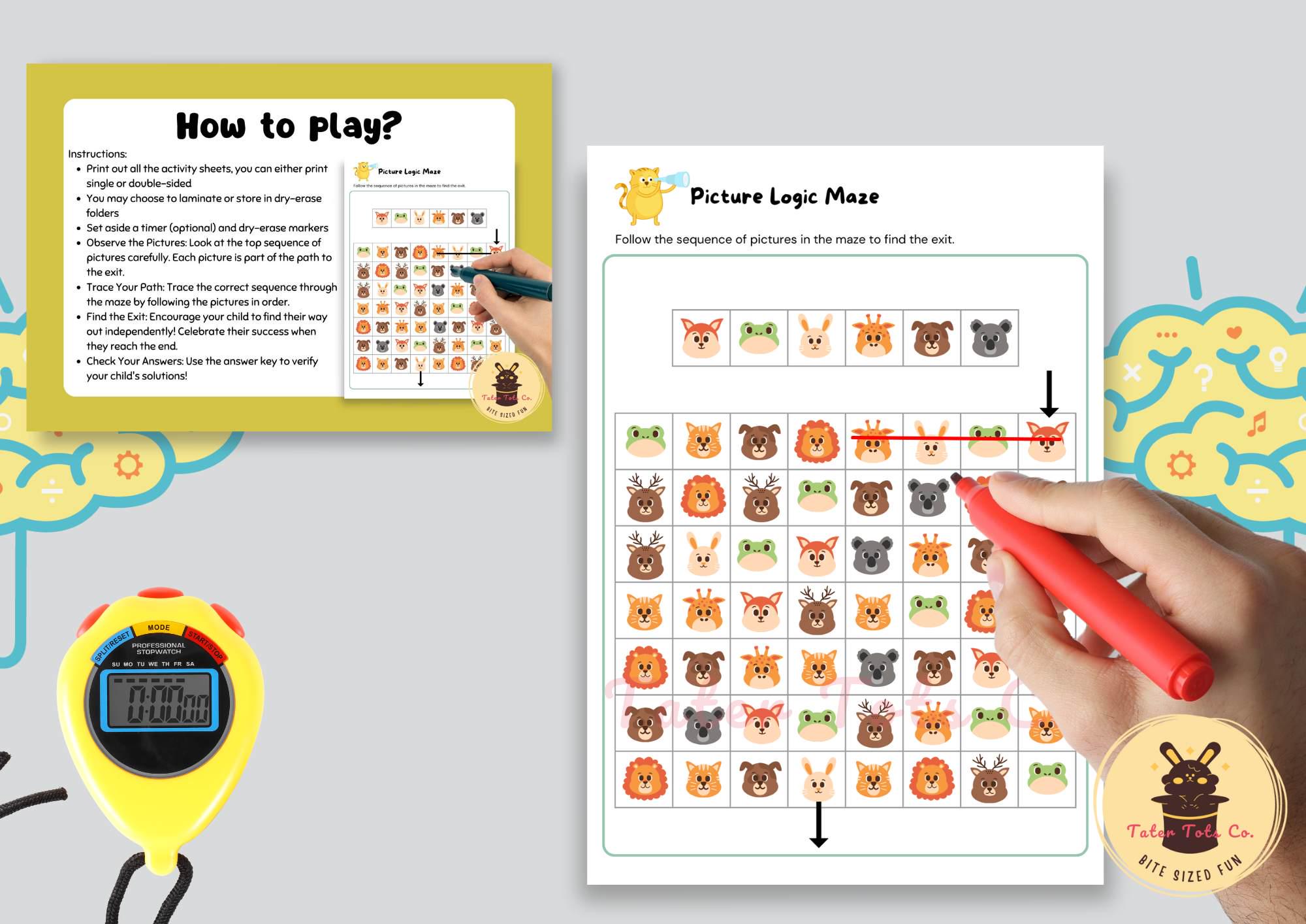This collection features 8 engaging mazes designed specifically for young children to enhance their memory, concentration, and visual discrimination skills. Each maze starts with a simple picture logic sequence of 4 pictures, guiding players to trace the same repeated picture to successfully navigate through the maze.
