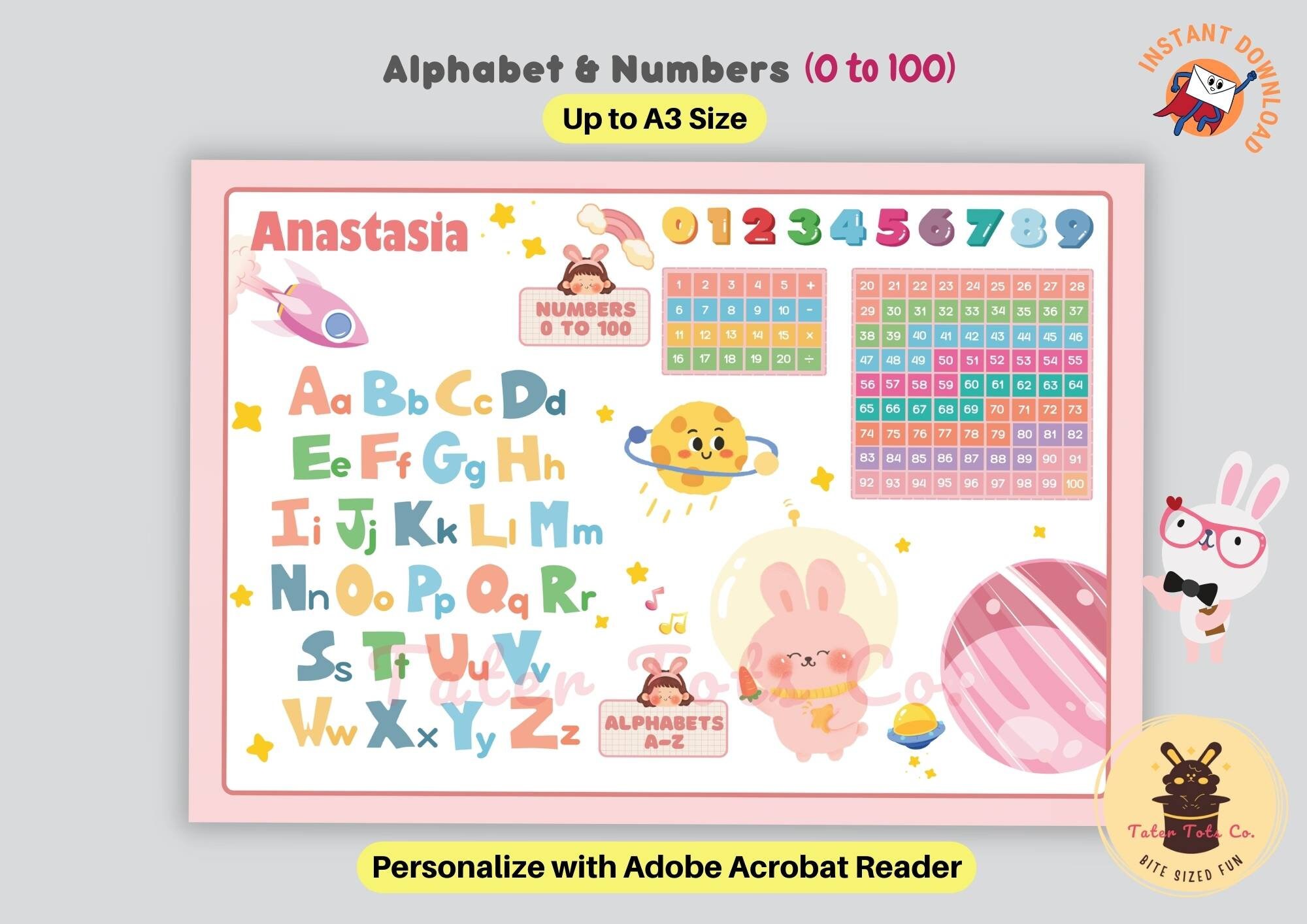 Cute Pink Space Bunny Alphabets and Numbers 1 to 100 Math Chart (Sublimation Design for desk pad)
