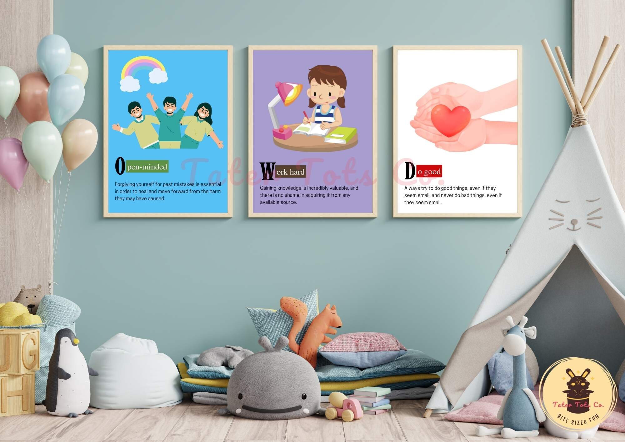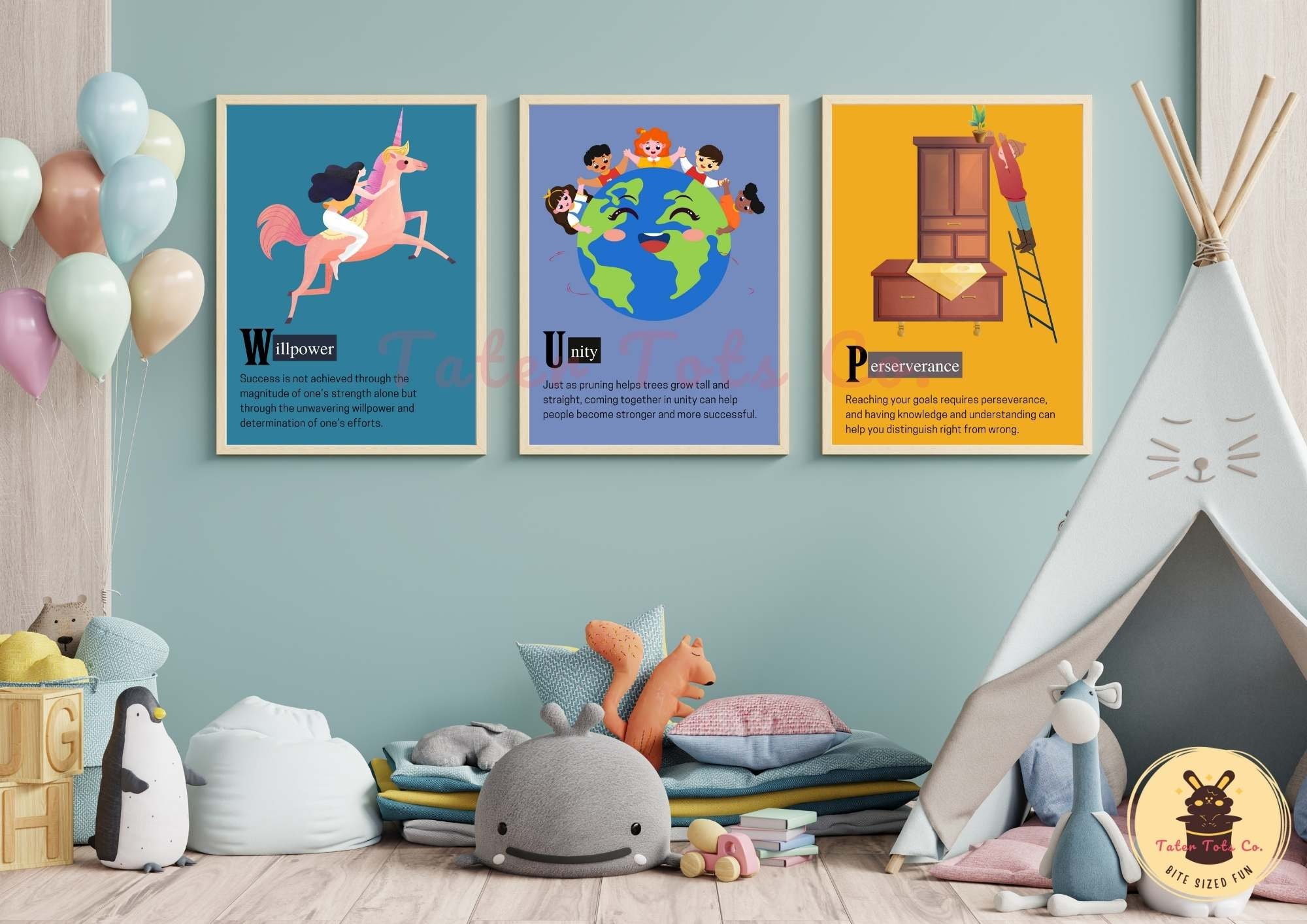 Introducing our collection of 27 captivating positive character trait posters designed to inspire and motivate young minds. These simple and visually appealing classroom wall art pieces feature uplifting slogans, wise sayings, and proverbs that encourage students to embrace challenges, persevere through obstacles, develop resilience, and believe in their potential to learn and grow.