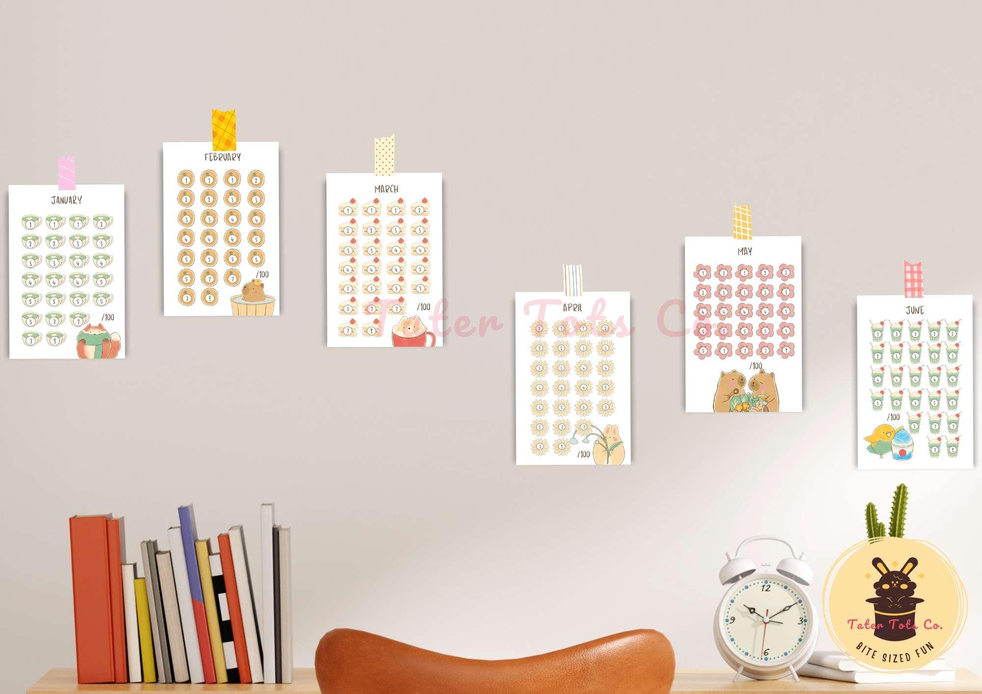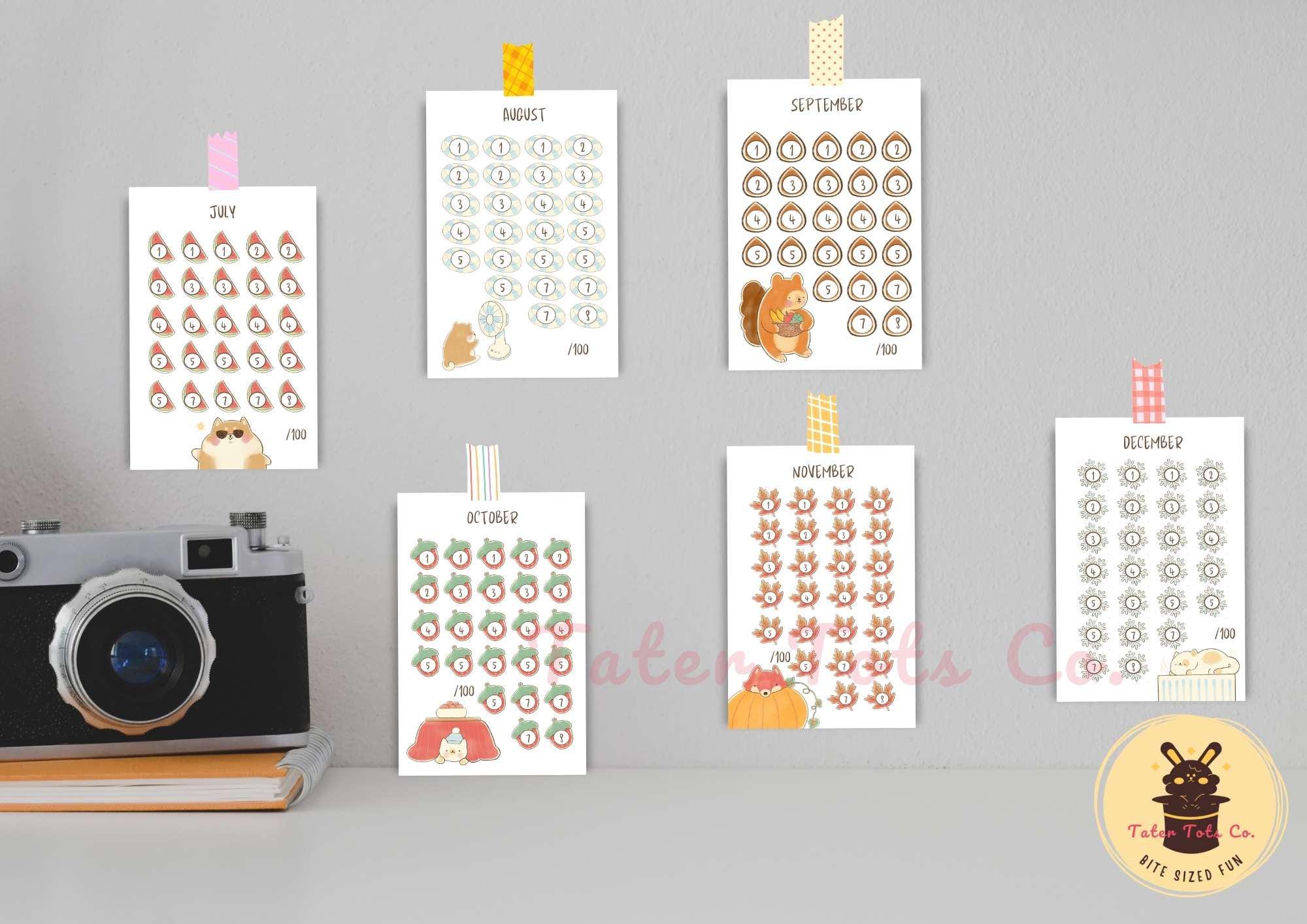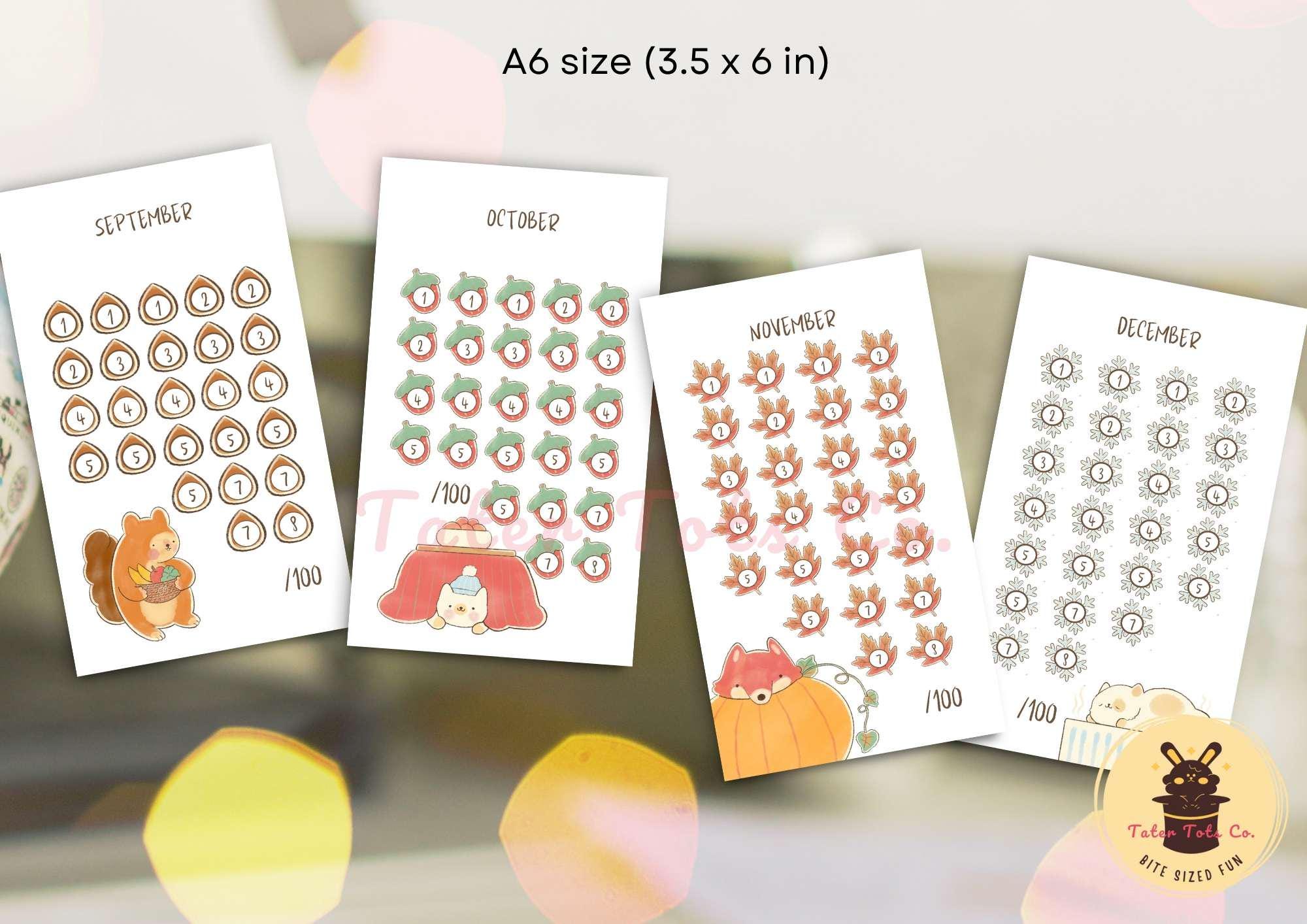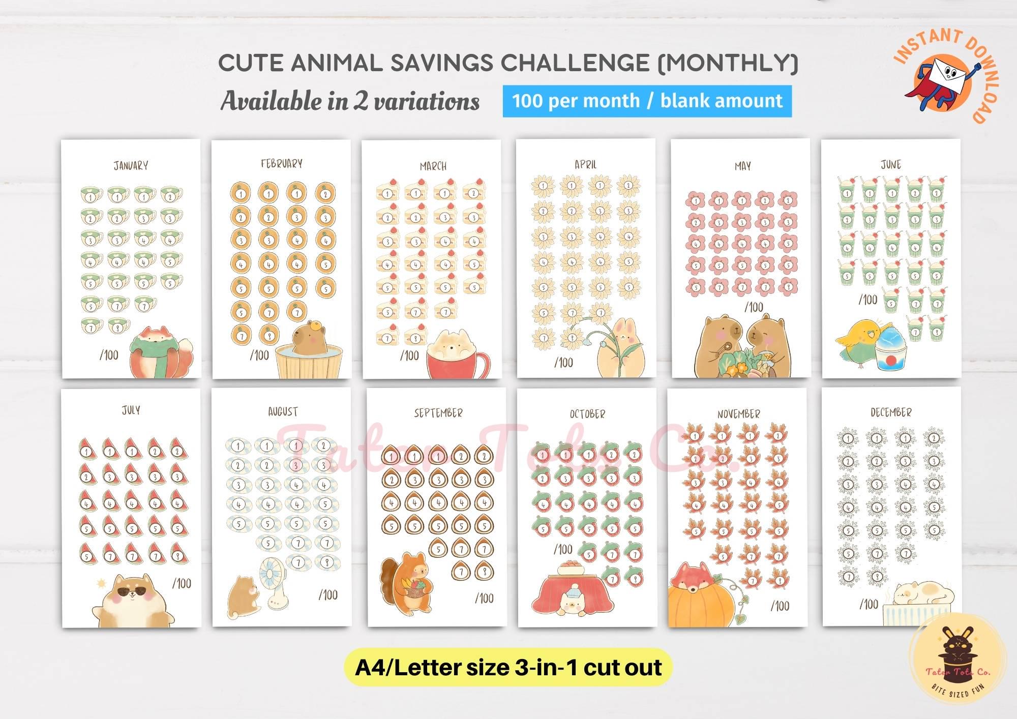 • Cute Animals 12-month savings challenge (4 x 6 in and A4/Letter size 3-in-1 cut out - each 3.5 x 6 in for A6 binder) With Savings Amount ($100/month) and blank