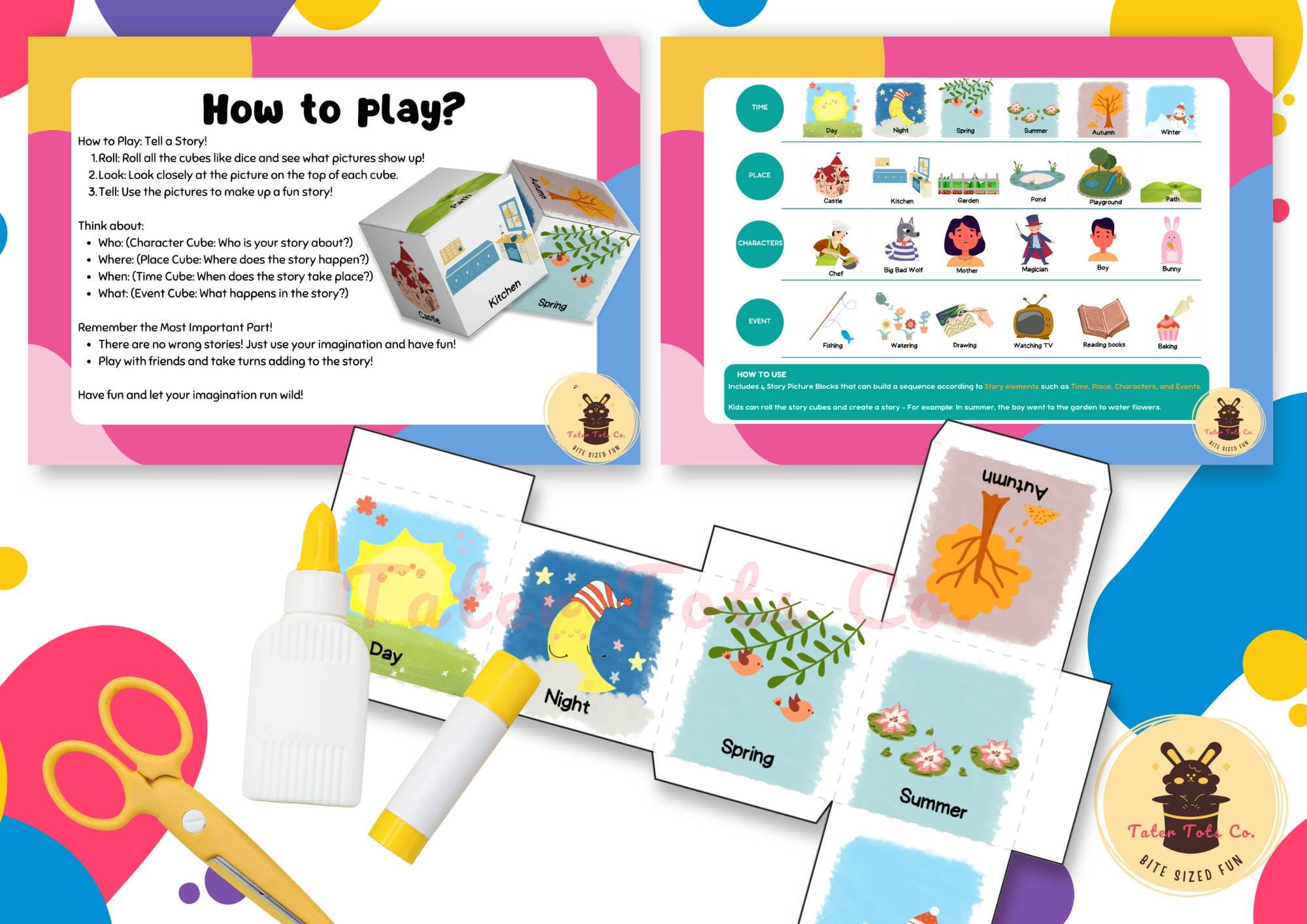 This digital download includes four easy-to-use story cube templates categorized by basic storytelling elements: time, place, character, and events. Print the picture puzzle block templates on A4-size cardstock, cut them out, fold them, and glue them. Suitable for kids ages 3 and above, these storytelling blocks can be used in preschool classrooms, homeschooling, or group play activities.