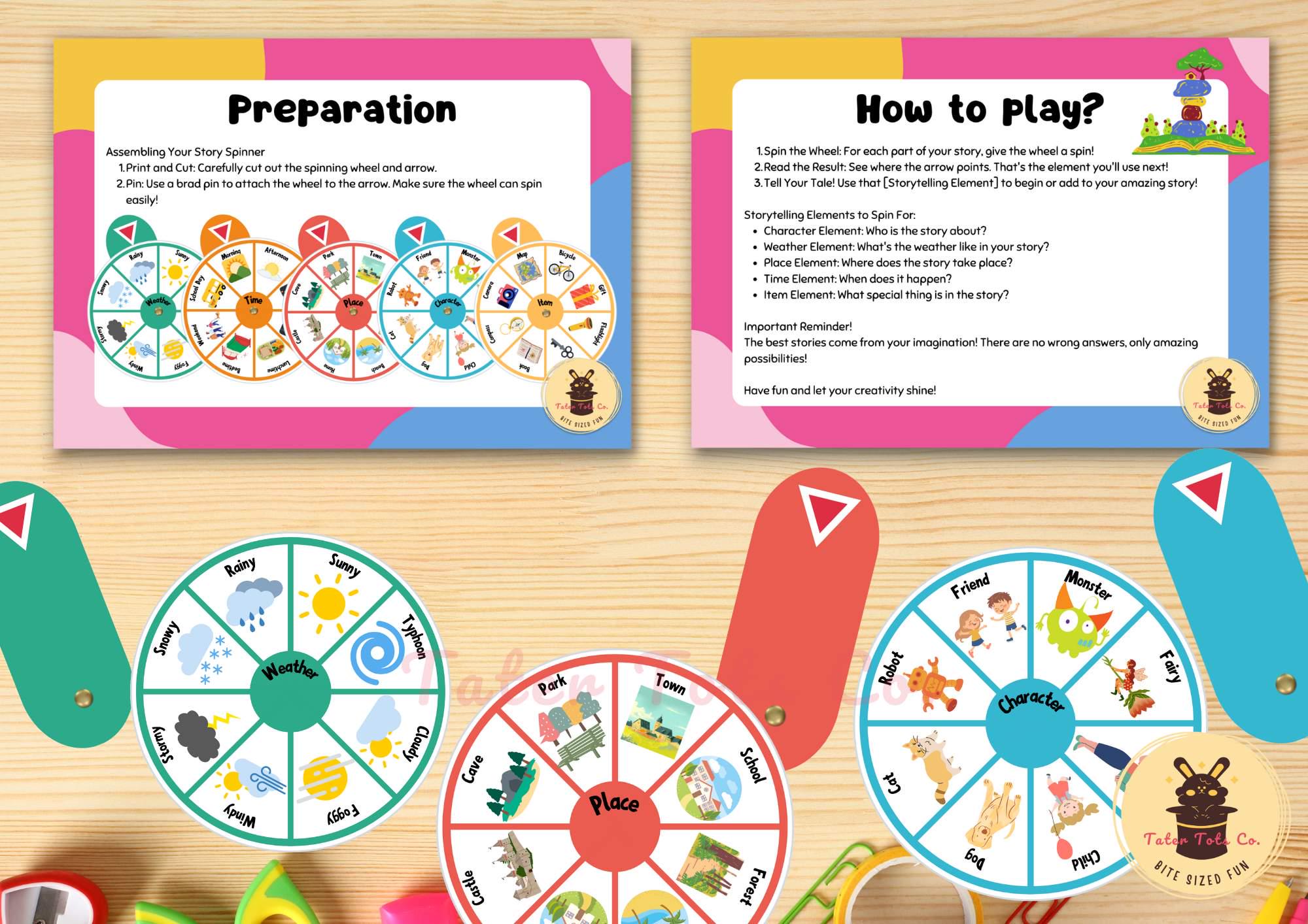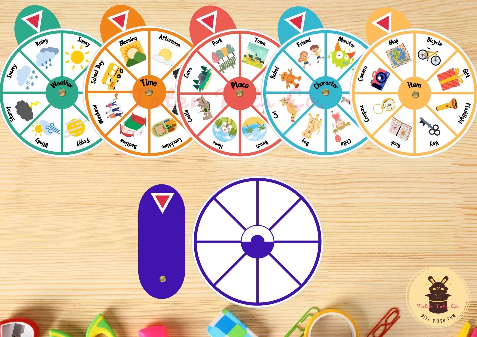 This digital download consists of 6 easy-to-use storytelling spinner templates categorized by basic storytelling elements such as weather, time, place, character, activity, and a blank template for your custom inputs. Intended to guide young kids to develop sequencing skills and visual storytelling abilities, encouraging creative thinking.