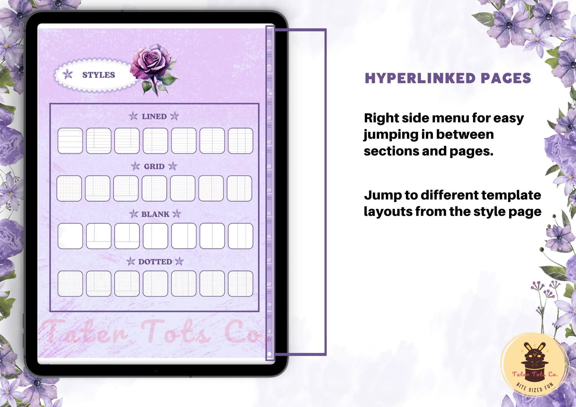Purple Blossoms Digital Notebook: Hyperlinked A4 PDF, Floral Stickers (Goodnotes)