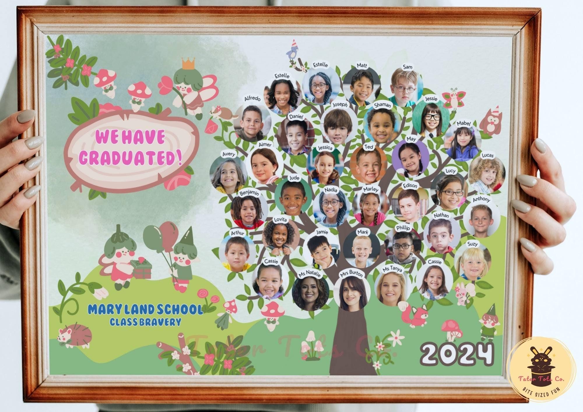 School Graduation Student Photo Collage for Kindergarten, Grad Party Diploma End of Year Class of 2024 Forest Theme Canva Template