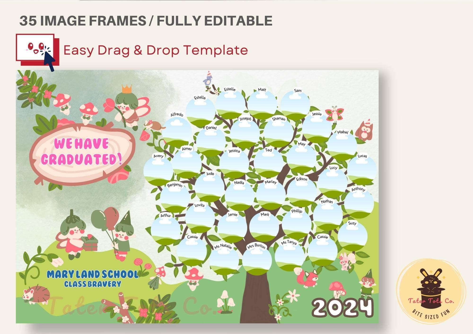 This Canva template consists of 35 picture/image frames. Simply pop your photos in these frames and reposition them. You can adjust the image frames and add/delete image frames to adjust the number of students based on your class size.