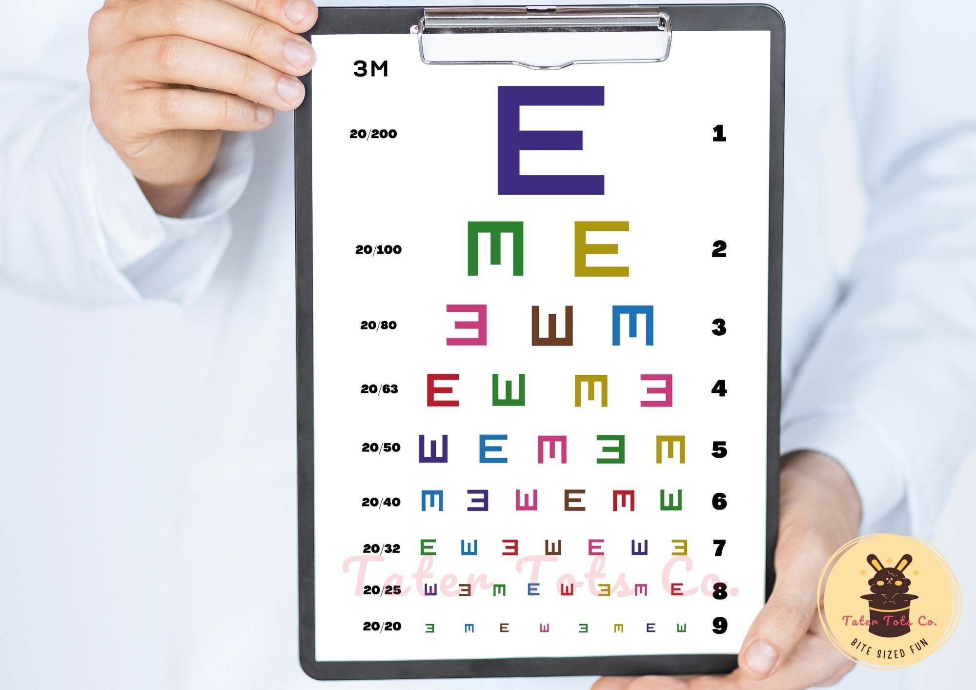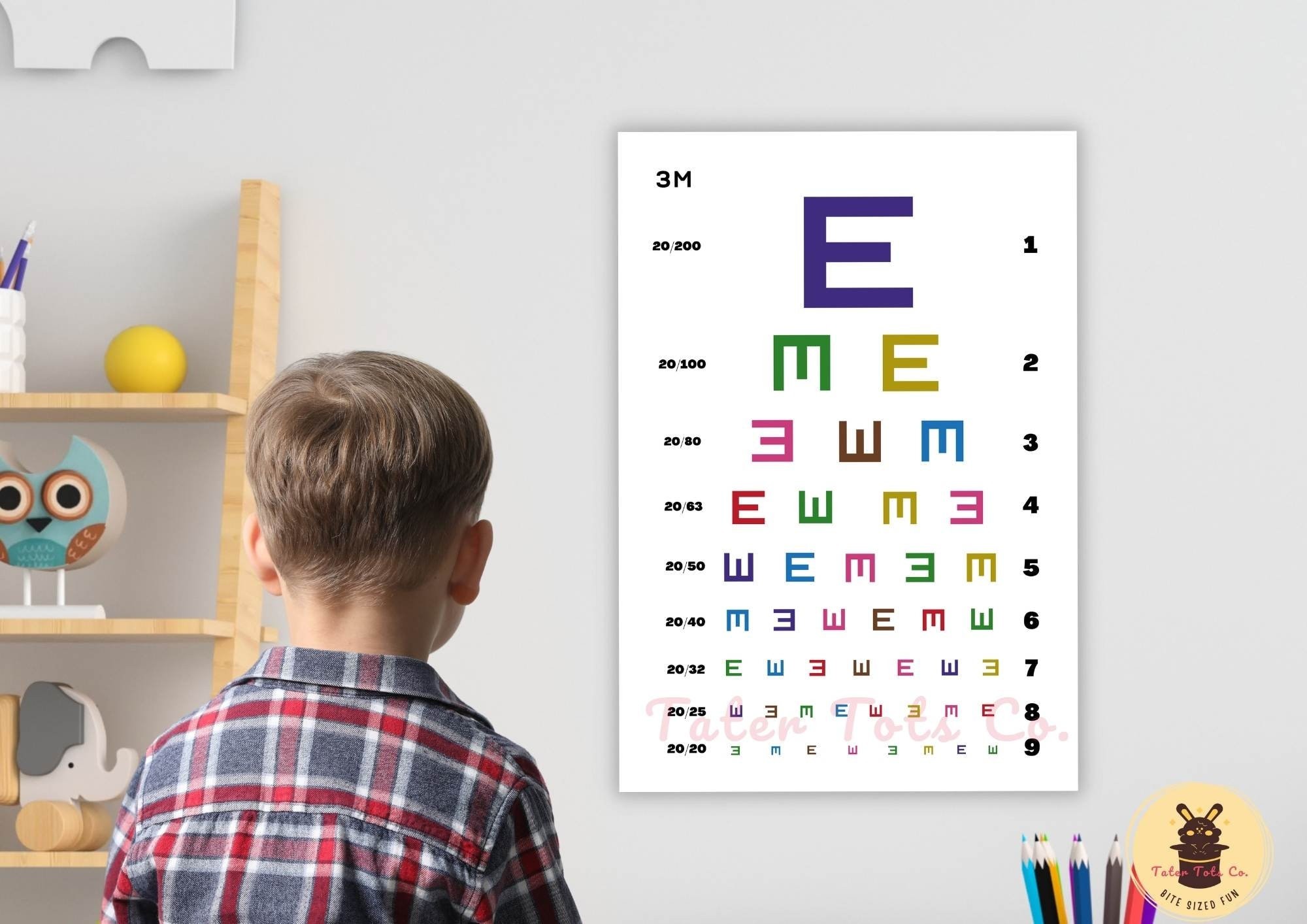 Simple Rainbow Tumbling Letter E Eye Test Chart Ophthalmology Snellen and Decimal Equivalent Wall Art Instant Download PDF