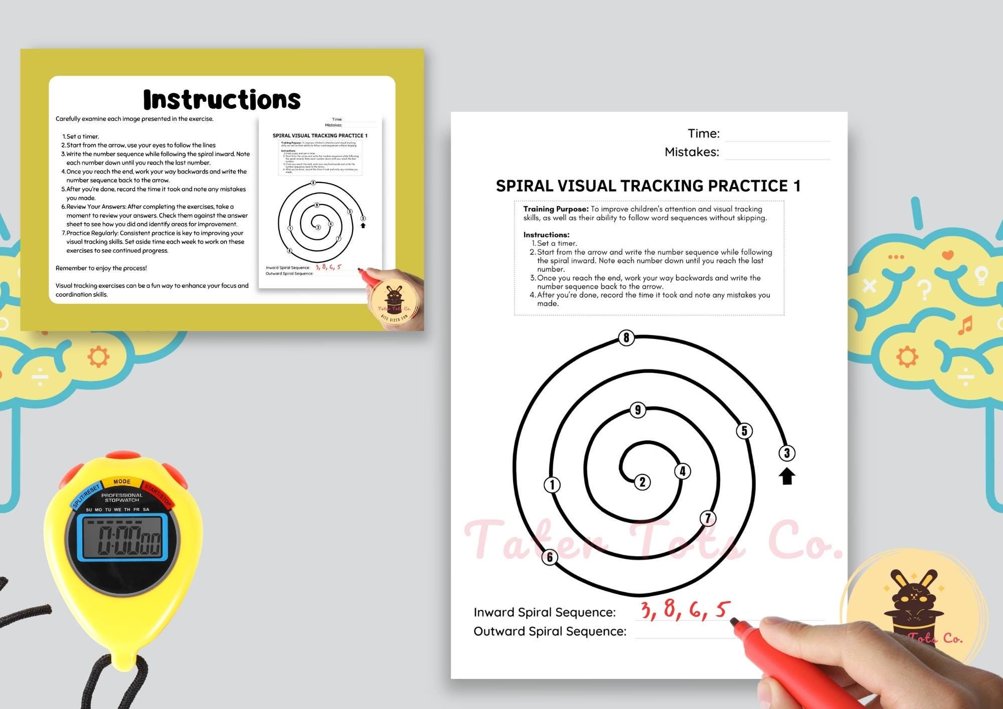 Enhance your child's visual tracking abilities and attention span with our engaging Spiral Visual Tracking Practice Bundle. This set of 4 easy activities, each with varying difficulty levels, is designed to help children follow number sequences accurately without skipping. By tracing numbers along a spiral path, kids will develop crucial skills like attention, visual tracking, and sequencing.