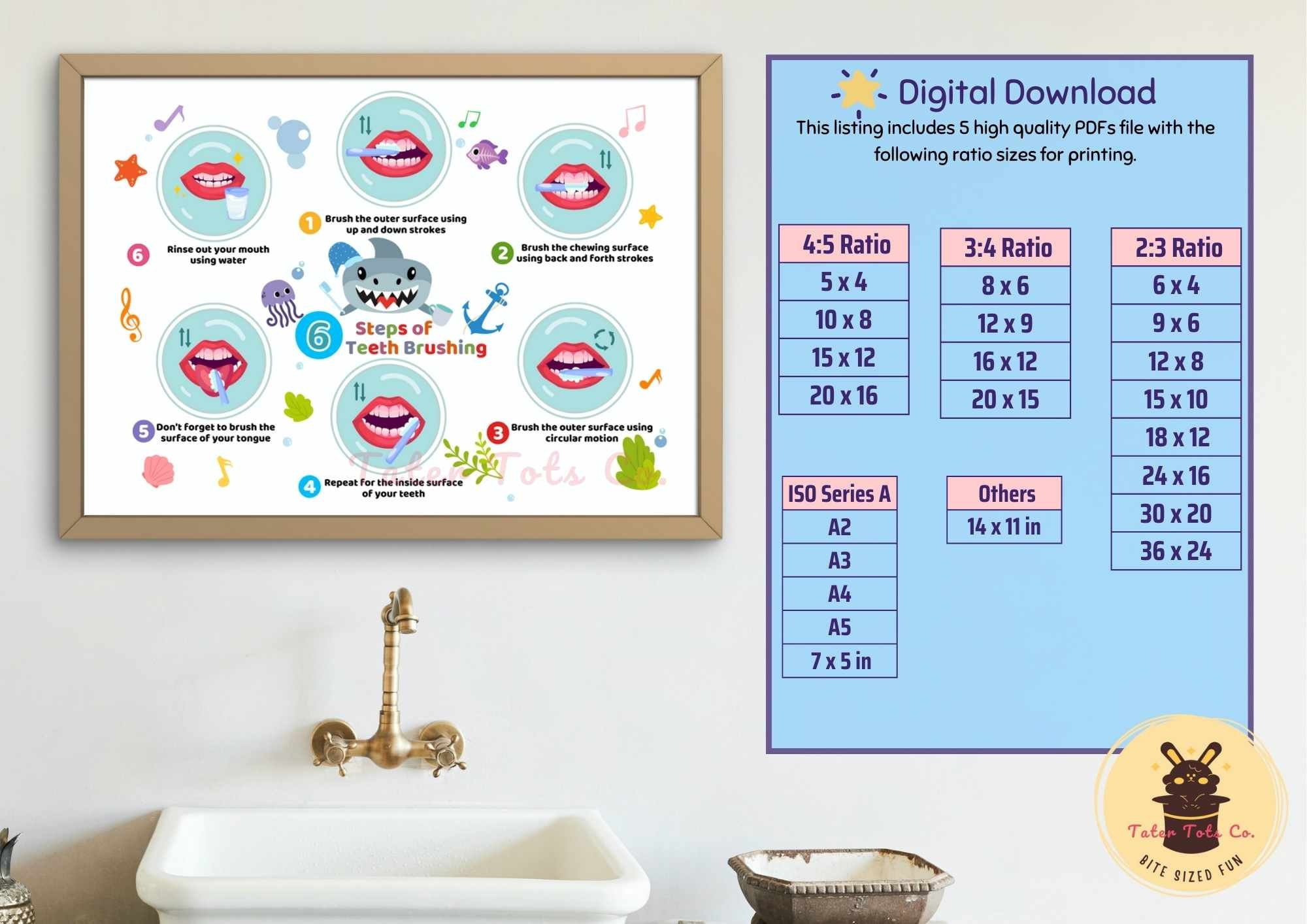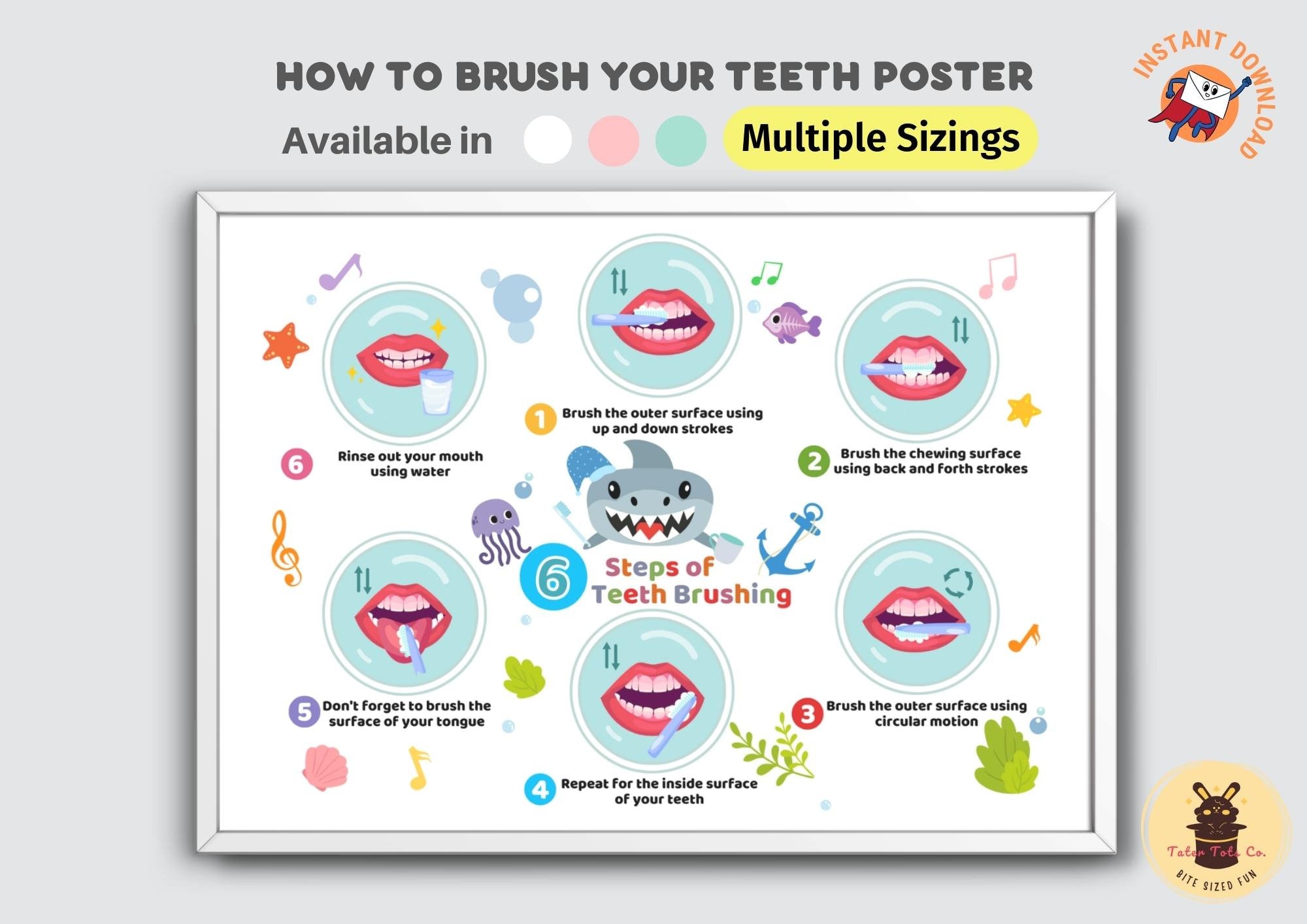 Steps on How to Brush Your Teeth Poster for Kids Dental Hygiene, Health and Wellness in the bathroom Instant Download (PDF)
