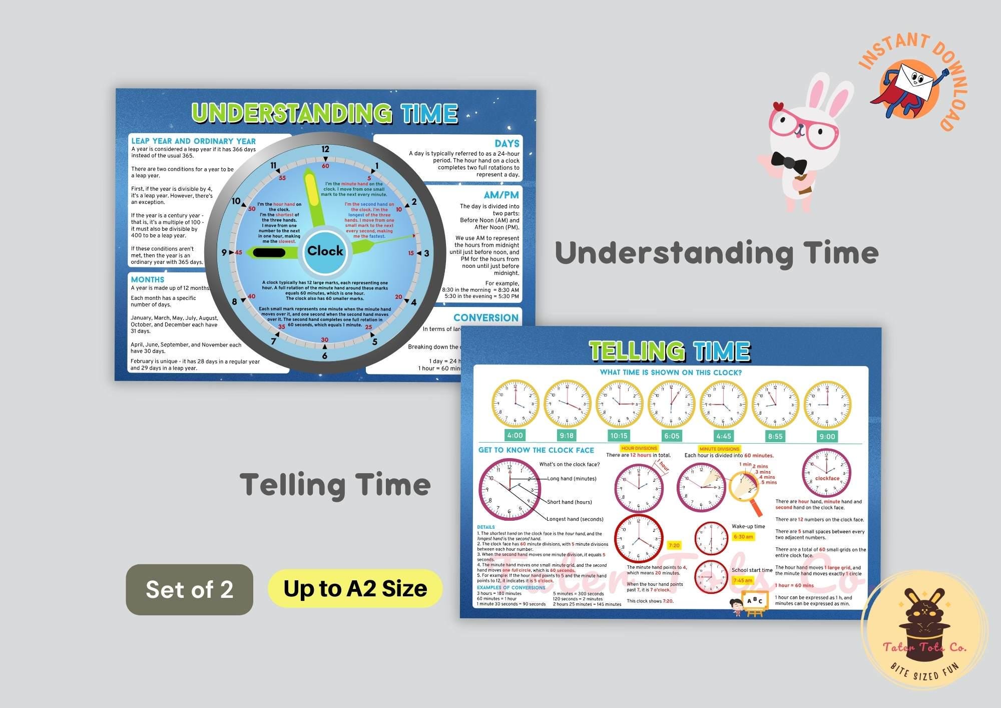 Telling Time and Understanding the Clockface Elementary Math Poster Bundle - Double-sided Flashcard Instant Download PDF