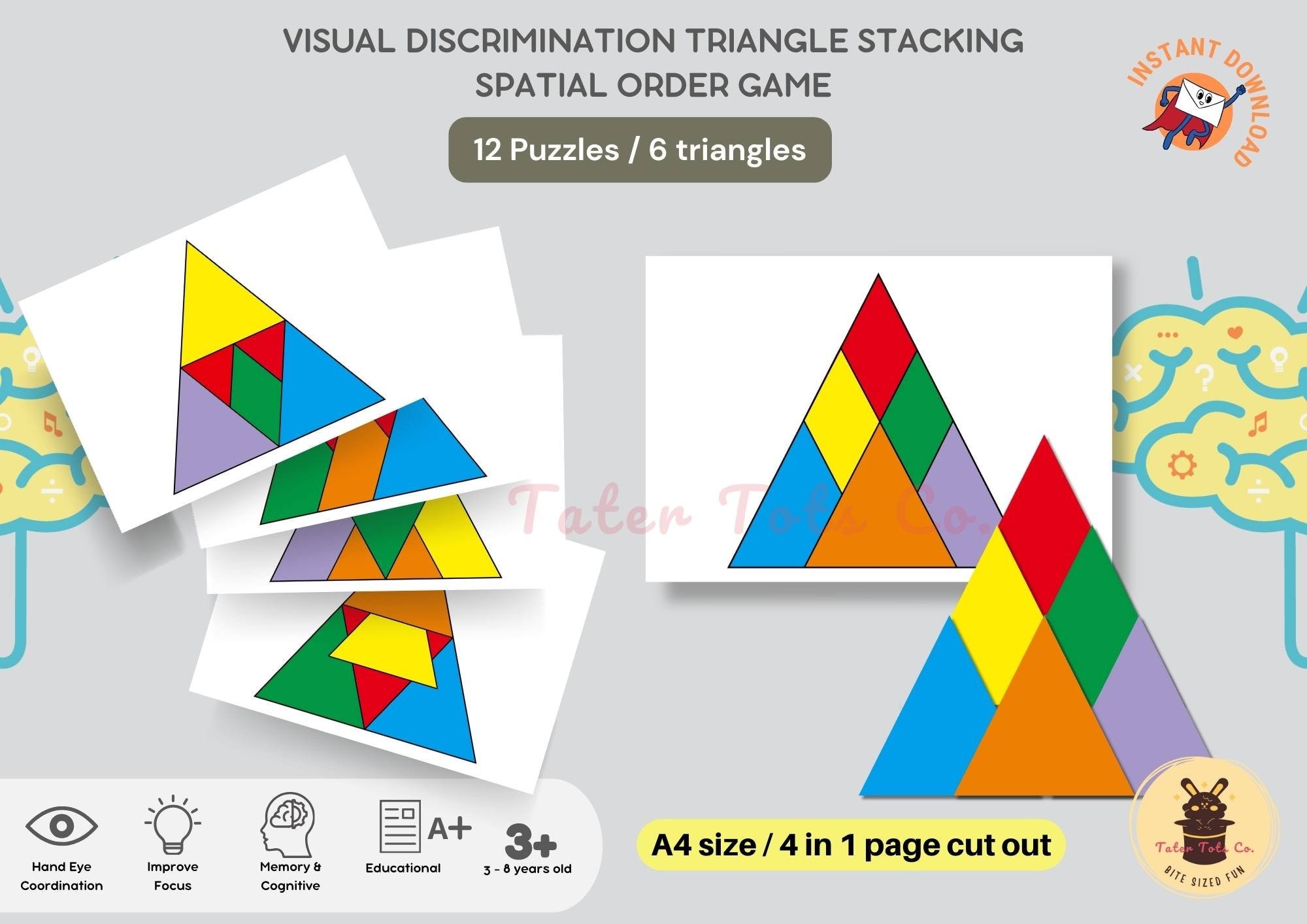 Visual Discrimination Stacking Triangle Spatial Order Pattern Game | 12 Puzzles for Early Learners Instant Download PDF