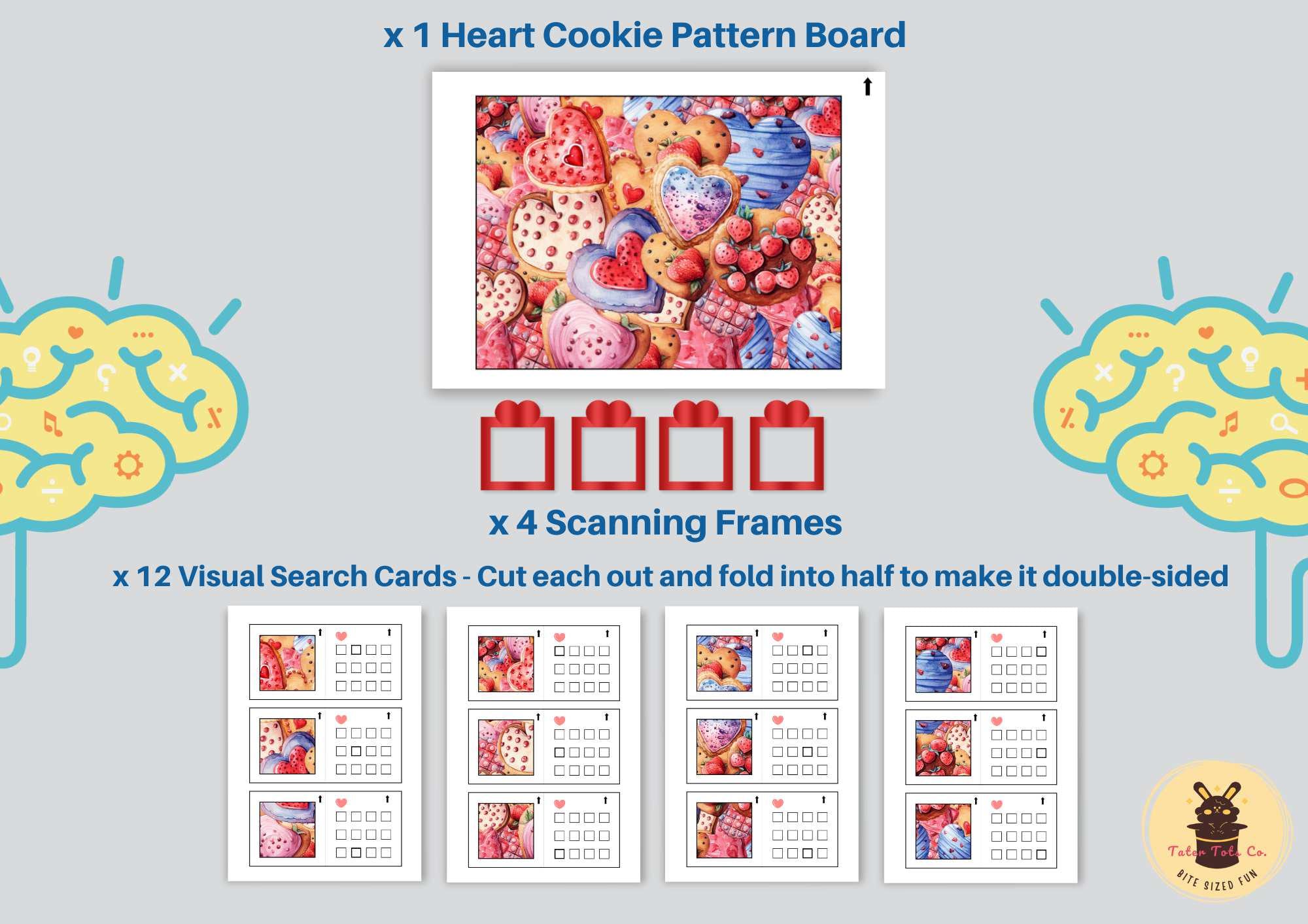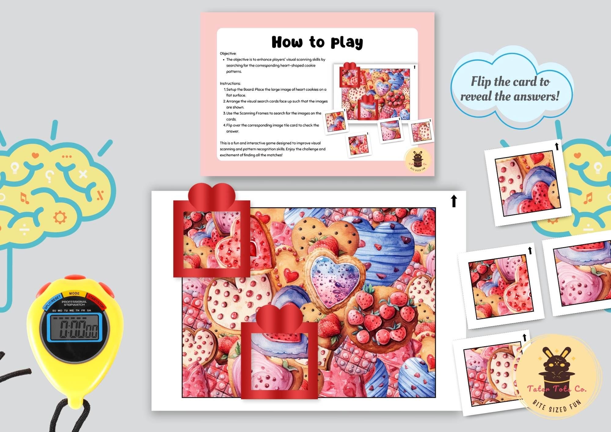 Kids will use the heart-shaped scanning frames and visual search cards to find matching heart cookie patterns on the board. The puzzle also includes an answer key for self-checking when you flip over the cards, making it suitable for independent learning or group activities.