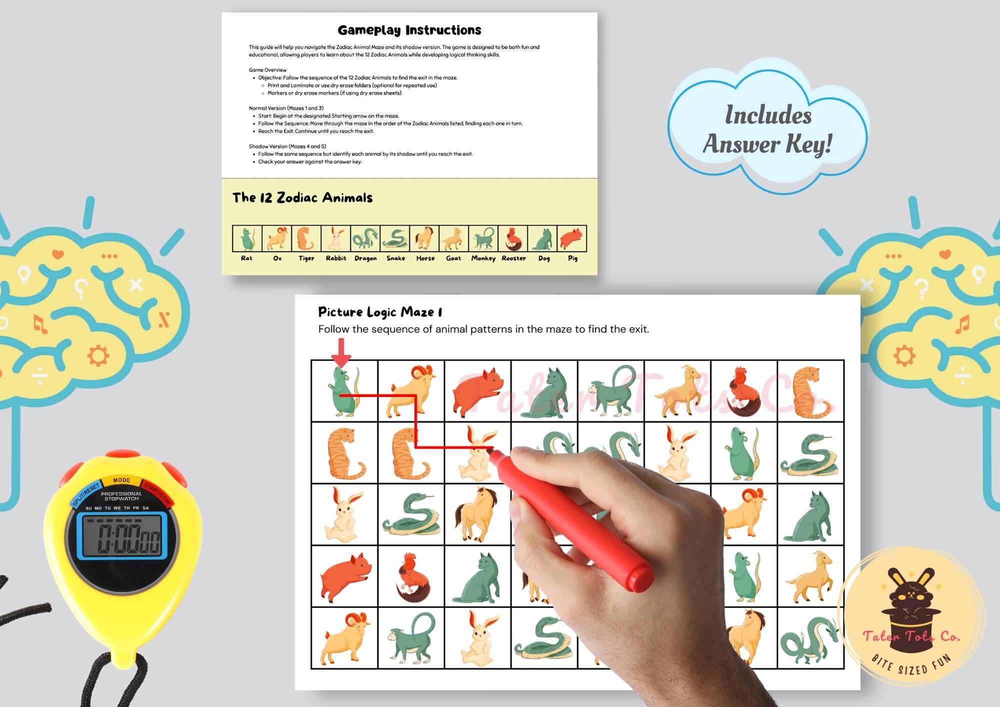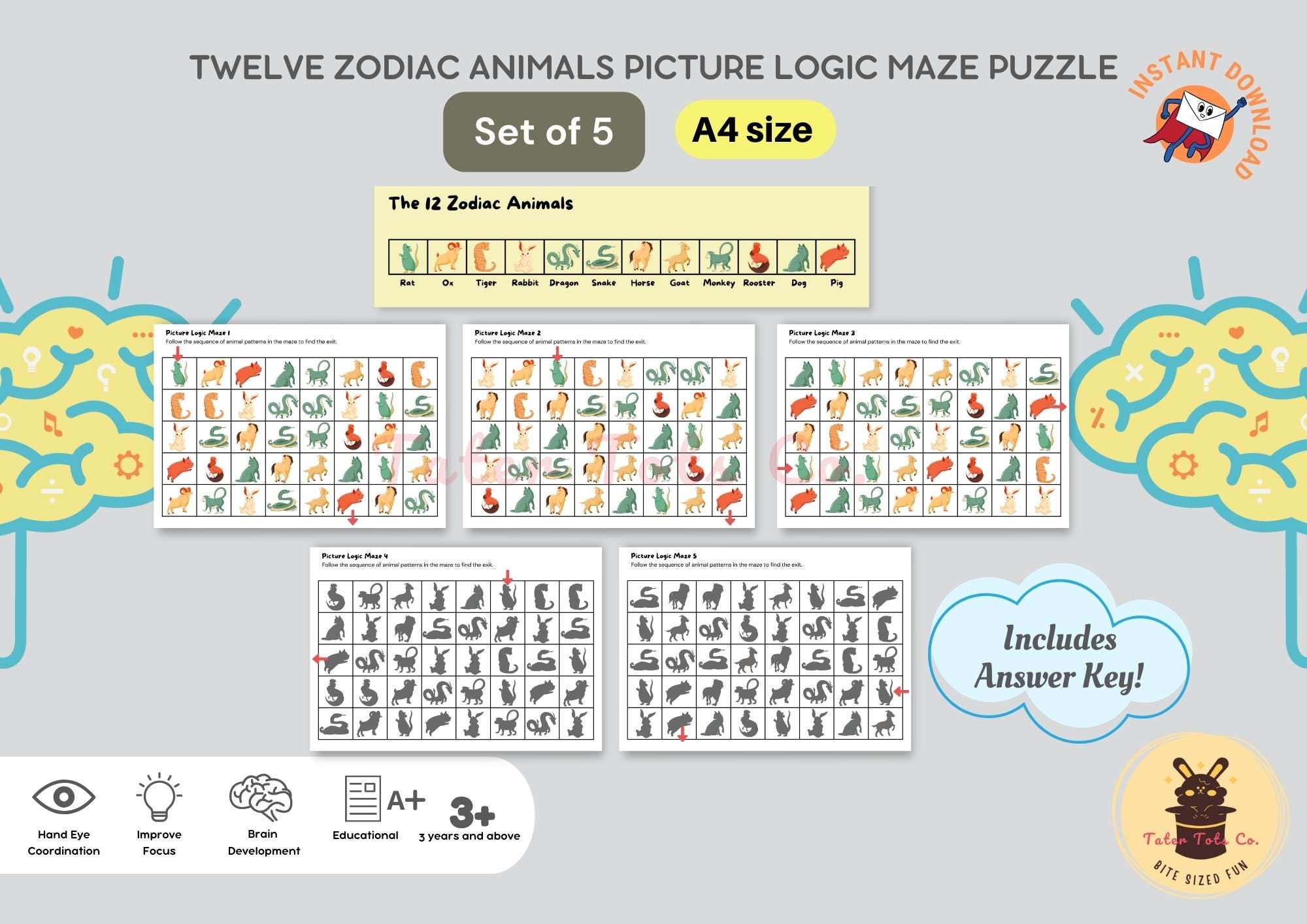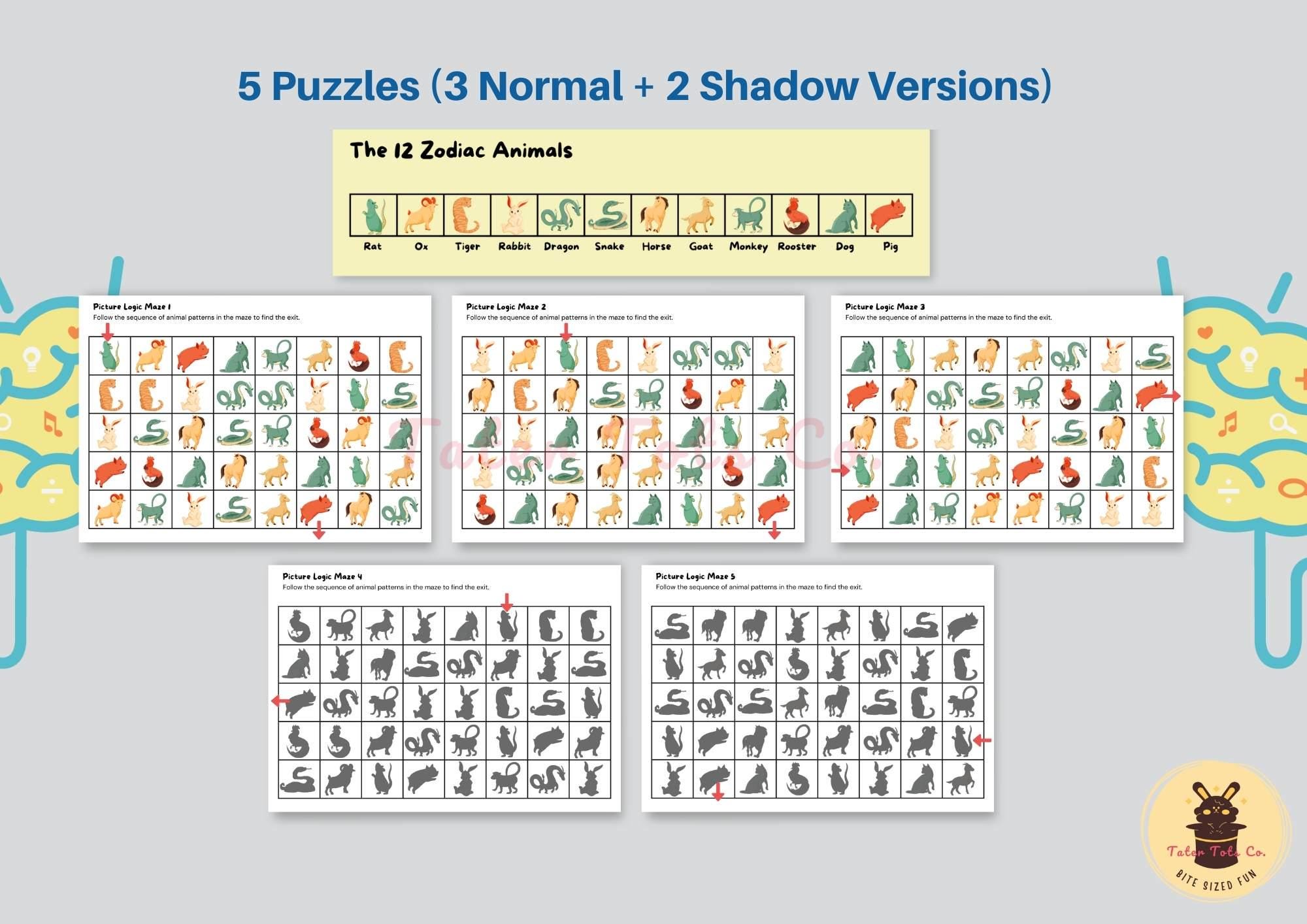 • The 12 Zodiac Animals Picture Logic Maze Puzzle (Set of 5) + Answer Key