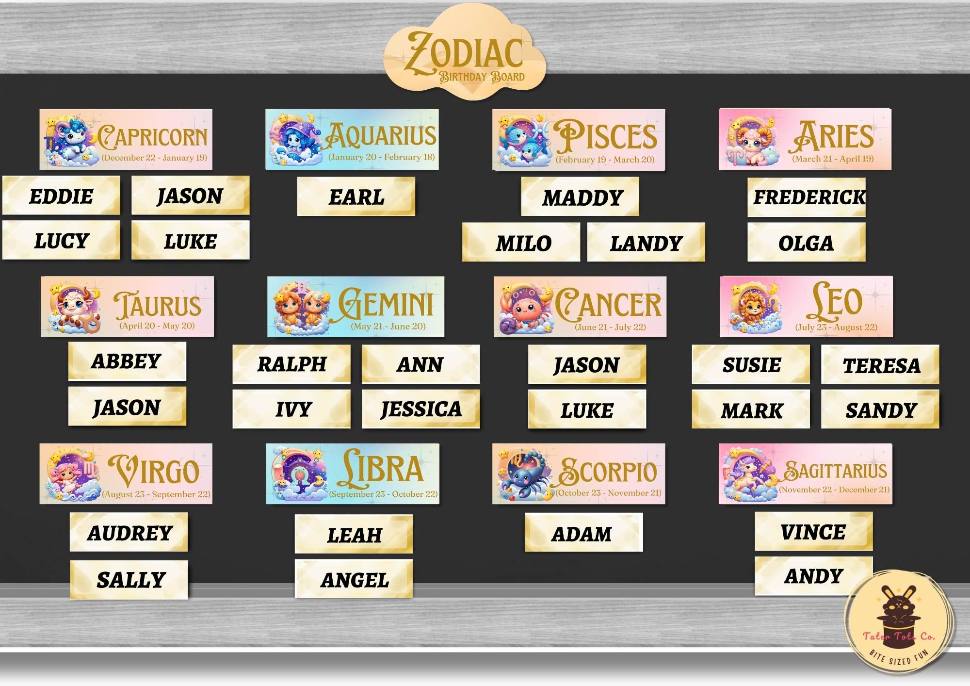 Zodiac Star Sign Birthday Board: Cosmic Classroom Celebration Astrology Display with Cute Illustrations - Instant Download PDF
